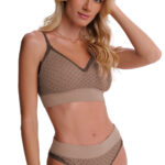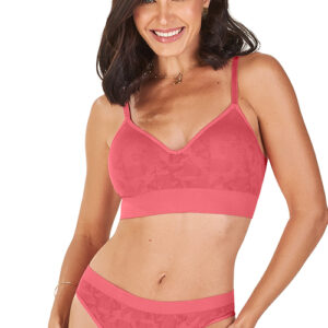Conjunto composto por sutiã em jacquard com bojo macio (sem bolha e sem arco), duplo e com maior cobertura lateral, proporcionando conforto e segurança. A calcinha sem costura, também em jacquard, oferece um ajuste perfeito ao corpo.